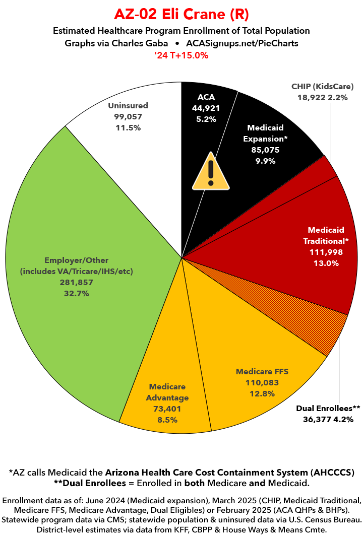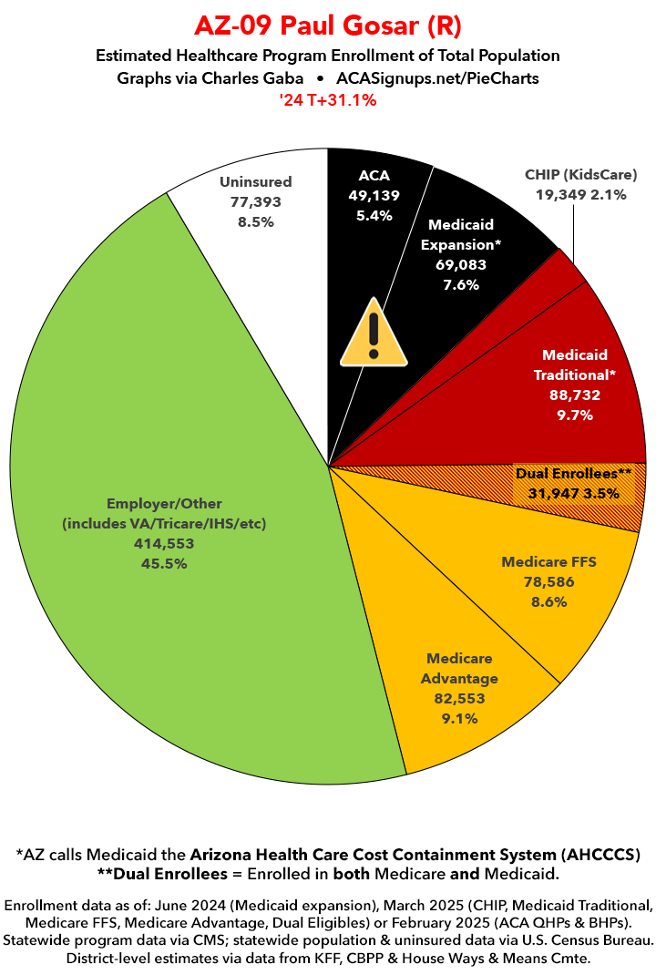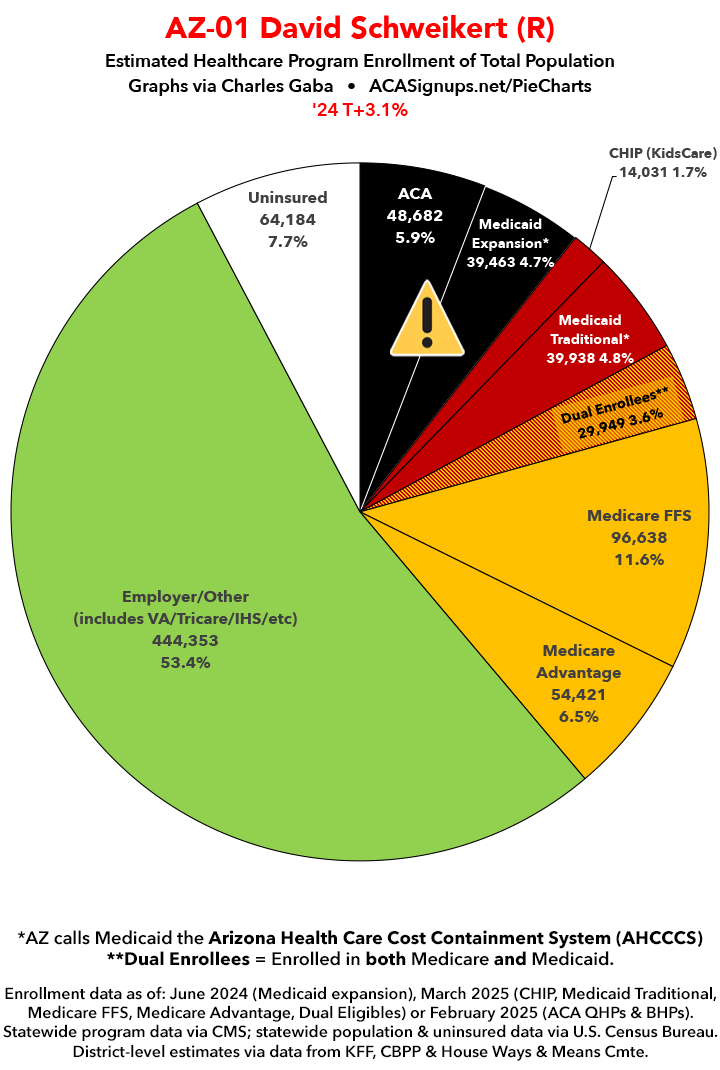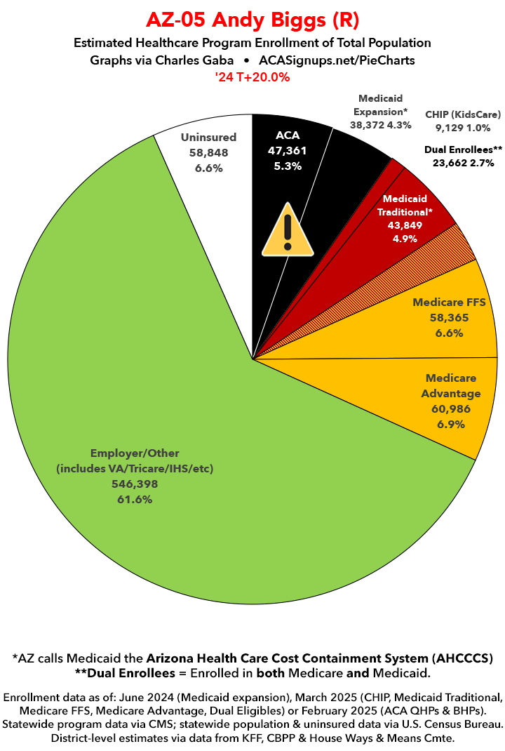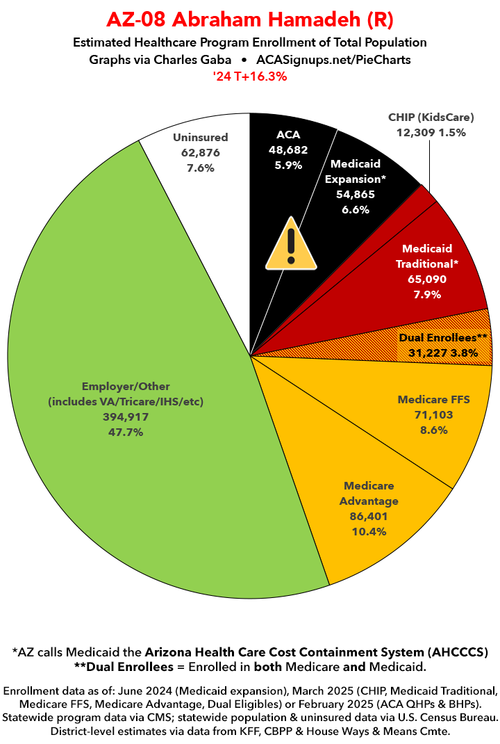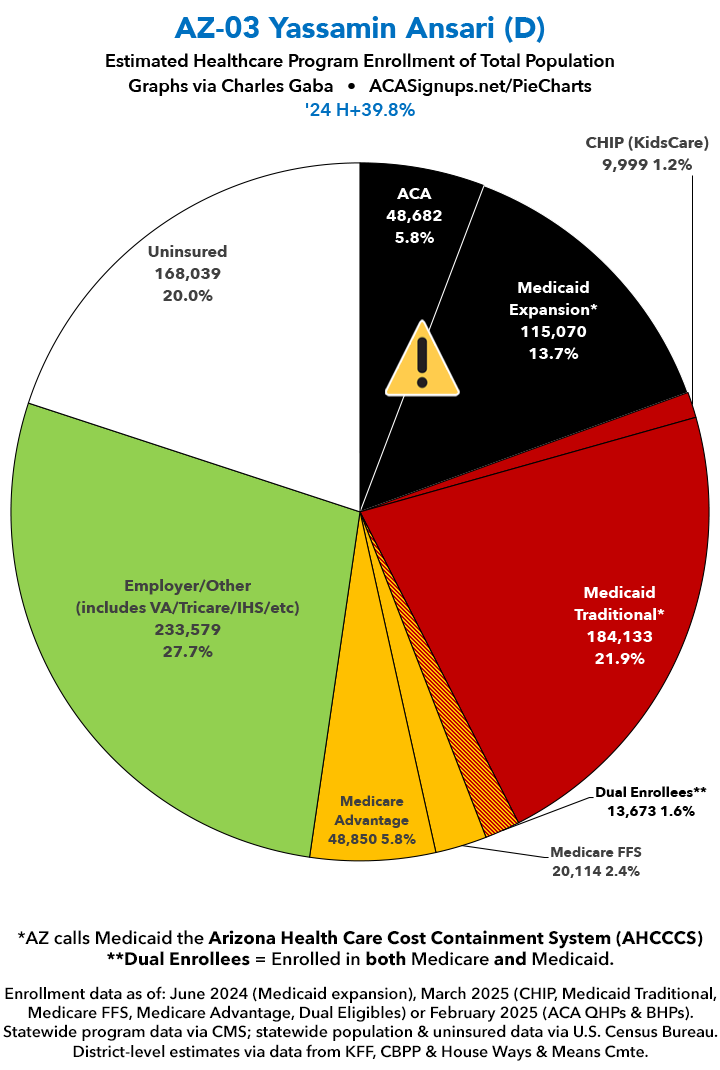 UPDATE 7/1/25: I've updated the web versions of the graphics with the most up-to-date enrollment data I have access to. The black sections w/the ⚠️ symbol are those most at risk of losing healthcare coverage due to H.R. 1, the "One Big Beautiful Bill Act" (aka the #MAGAMurderBill).
