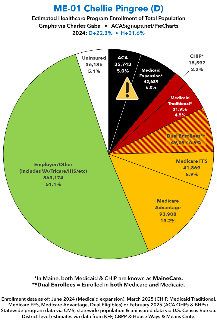 UPDATE 7/16/25: I've updated the web versions of the graphics with the most up-to-date enrollment data I have access to. The black sections w/the ⚠️ symbol are those most at risk of losing healthcare coverage due to H.R. 1, the "One Big Beautiful Bill Act" (aka the #MAGAMurderBill).​​​​​