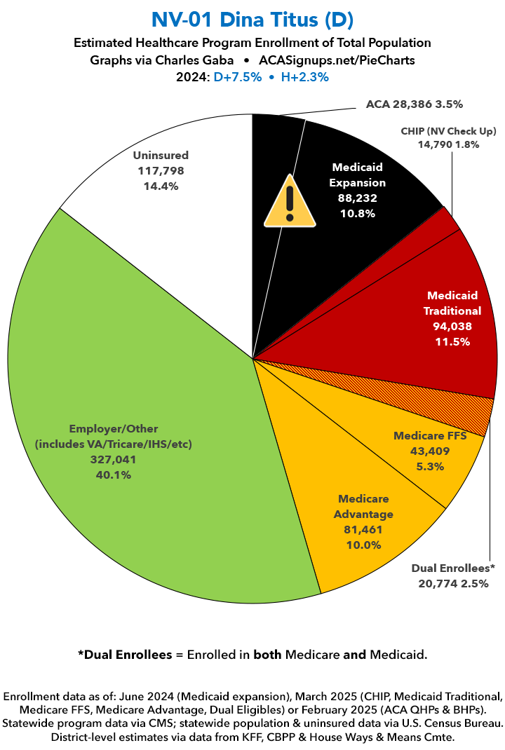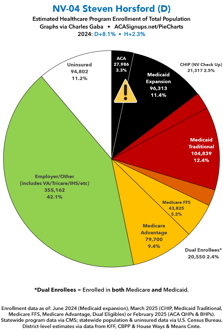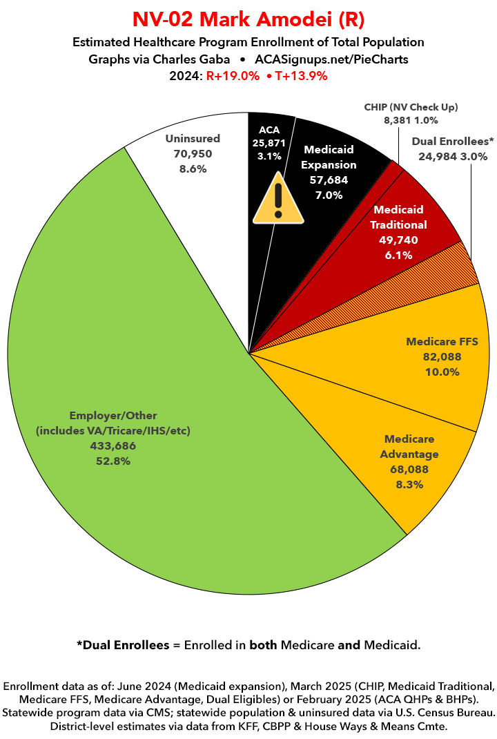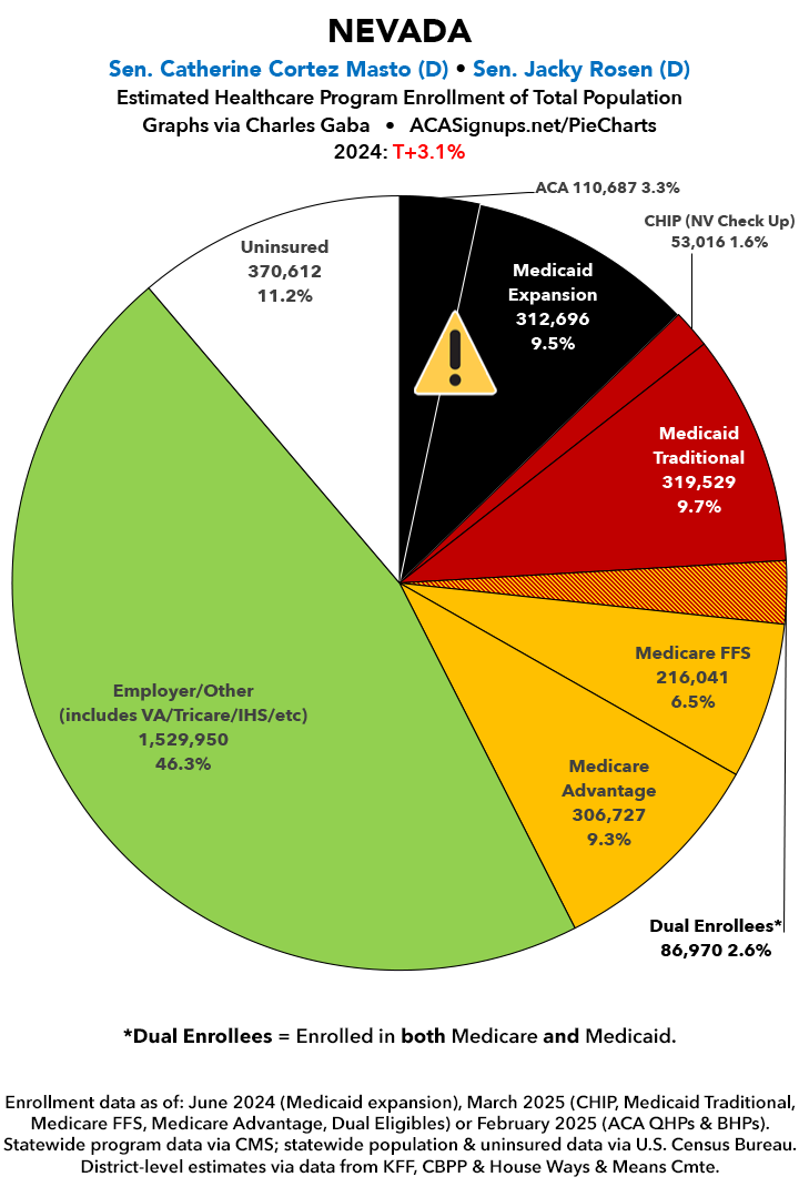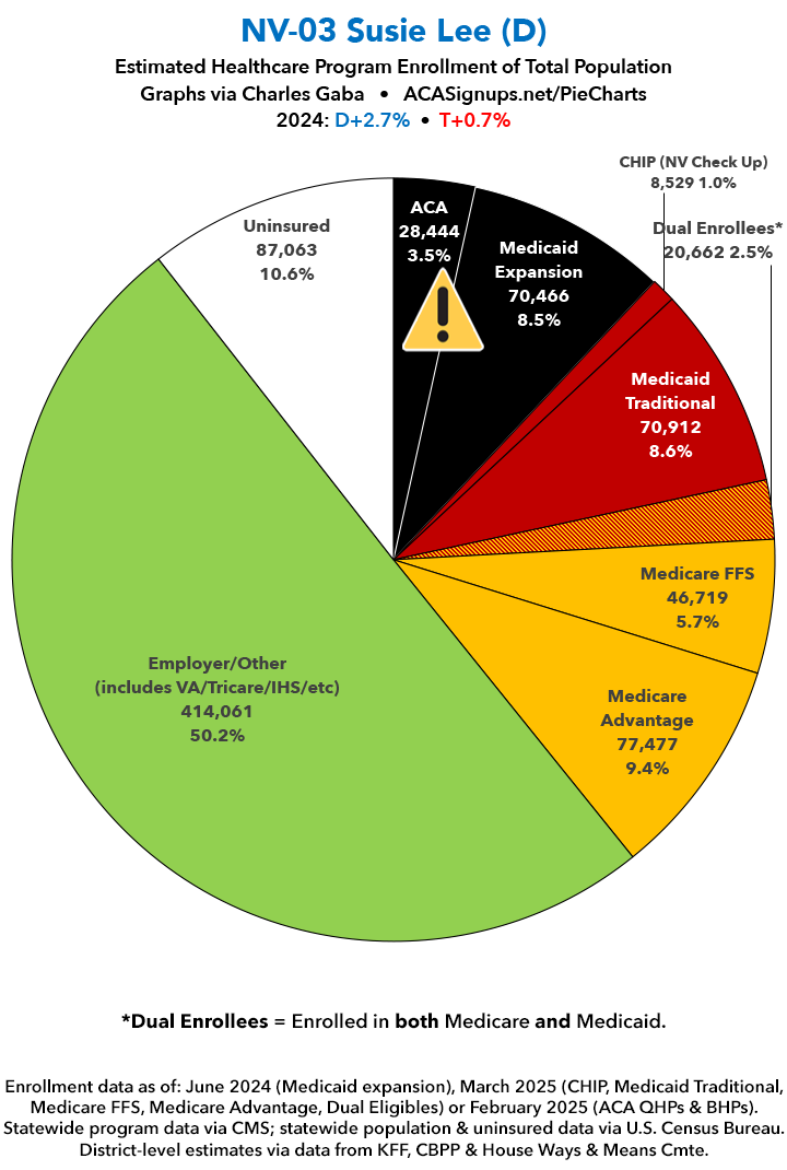 UPDATE 7/7/25: I've updated the web versions of the graphics with the most up-to-date enrollment data I have access to. The black sections w/the ⚠️ symbol are those most at risk of losing healthcare coverage due to H.R. 1, the "One Big Beautiful Bill Act" (aka the #MAGAMurderBill).