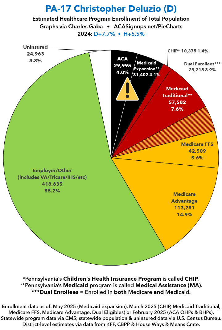 UPDATE 7/11/25: I've updated the web versions of the graphics with the most up-to-date enrollment data I have access to. The black sections w/the ⚠️ symbol are those most at risk of losing healthcare coverage due to H.R. 1, the "One Big Beautiful Bill Act" (aka the #MAGAMurderBill).