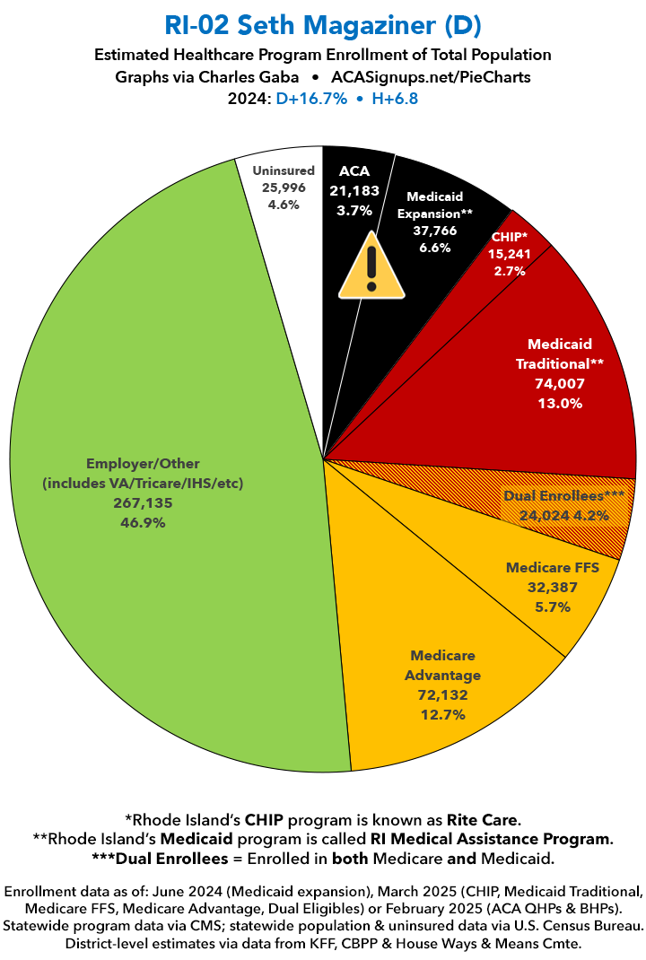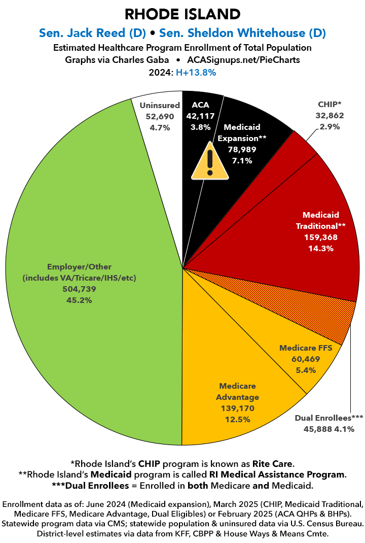 UPDATE 7/16/25: I've updated the web versions of the graphics with the most up-to-date enrollment data I have access to. The black sections w/the ⚠️ symbol are those most at risk of losing healthcare coverage due to H.R. 1, the "One Big Beautiful Bill Act" (aka the #MAGAMurderBill).