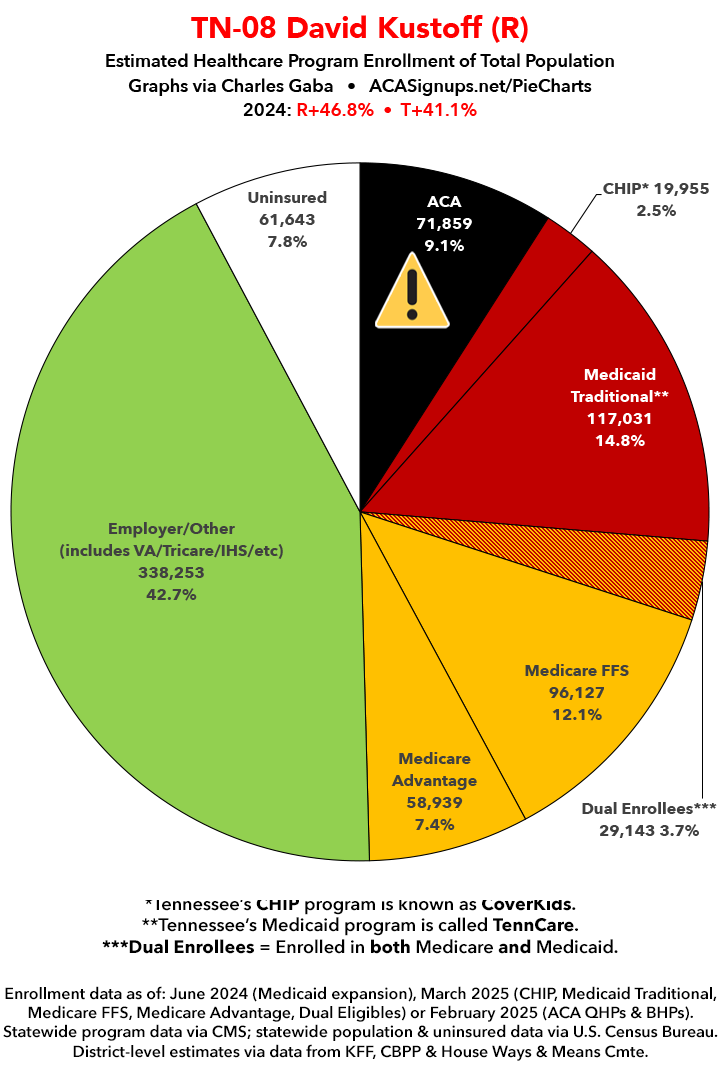 UPDATE 7/11/25: I've updated the web versions of the graphics with the most up-to-date enrollment data I have access to. The black sections w/the ⚠️ symbol are those most at risk of losing healthcare coverage due to H.R. 1, the "One Big Beautiful Bill Act" (aka the #MAGAMurderBill).