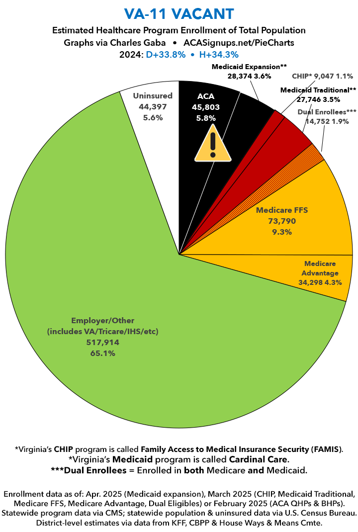 UPDATE 7/15/25: I've updated the web versions of the graphics with the most up-to-date enrollment data I have access to. The black sections w/the ⚠️ symbol are those most at risk of losing healthcare coverage due to H.R. 1, the "One Big Beautiful Bill Act" (aka the #MAGAMurderBill).​​​​​
