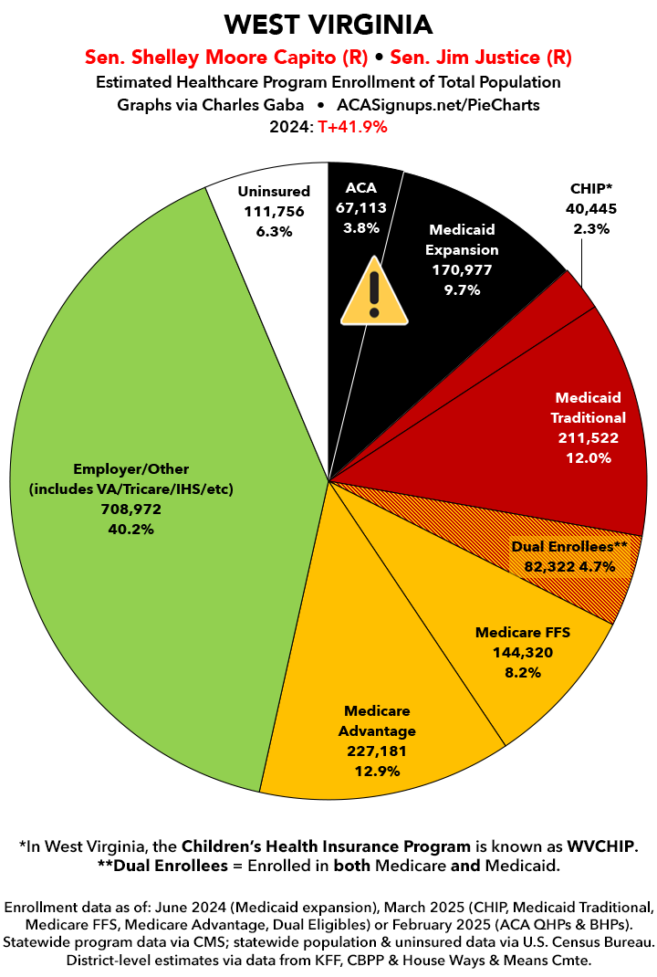 UPDATE 7/15/25: I've updated the web versions of the graphics with the most up-to-date enrollment data I have access to. The black sections w/the ⚠️ symbol are those most at risk of losing healthcare coverage due to H.R. 1, the "One Big Beautiful Bill Act" (aka the #MAGAMurderBill).​​​​​