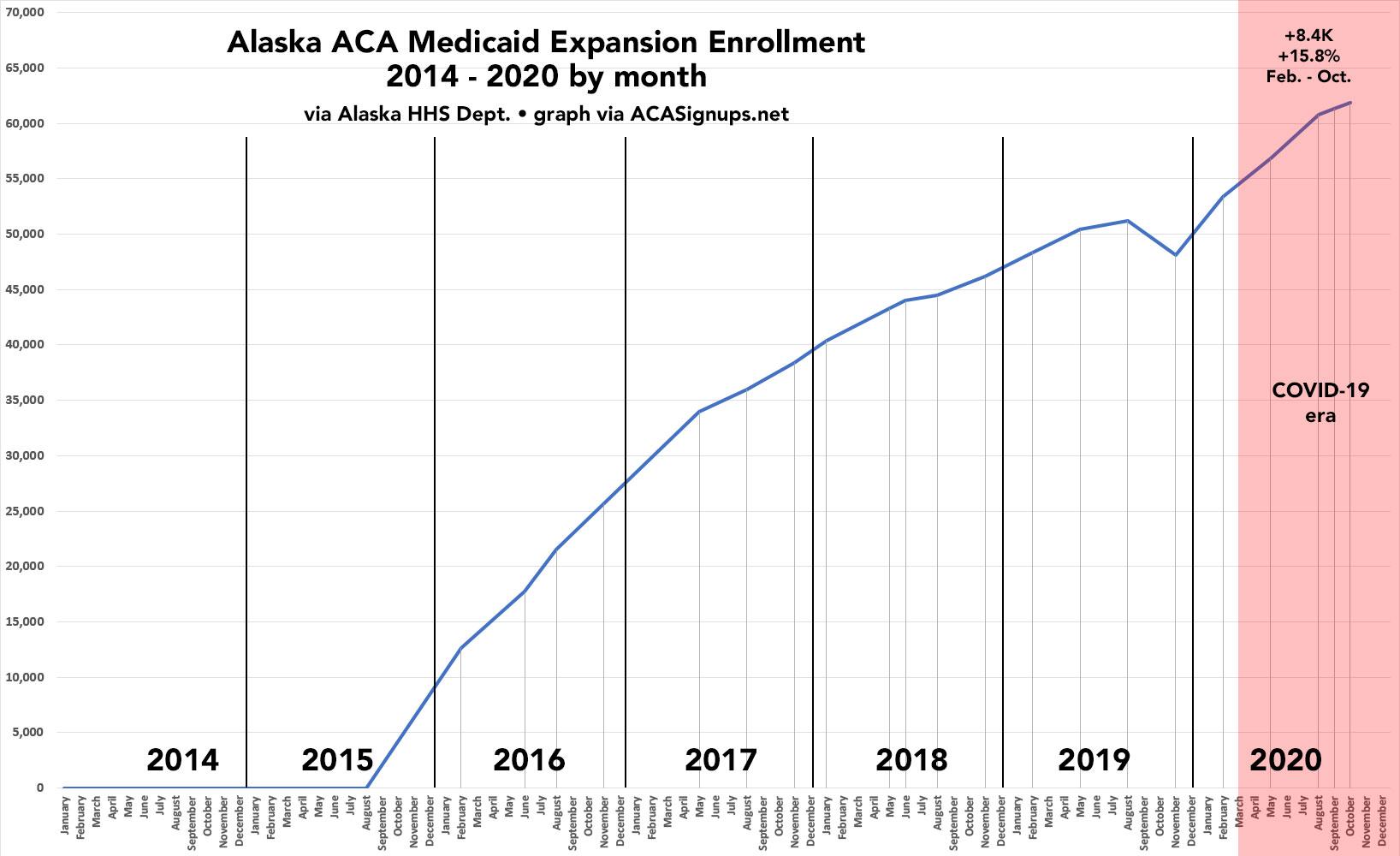 Instead of replicating his work, I decided to take a closer look at individual states. The graph below shows how many Alaskans have been actively enrolled in our Medicaid expansion program (Healthy Michigan) every month since it was launched in September 2015: