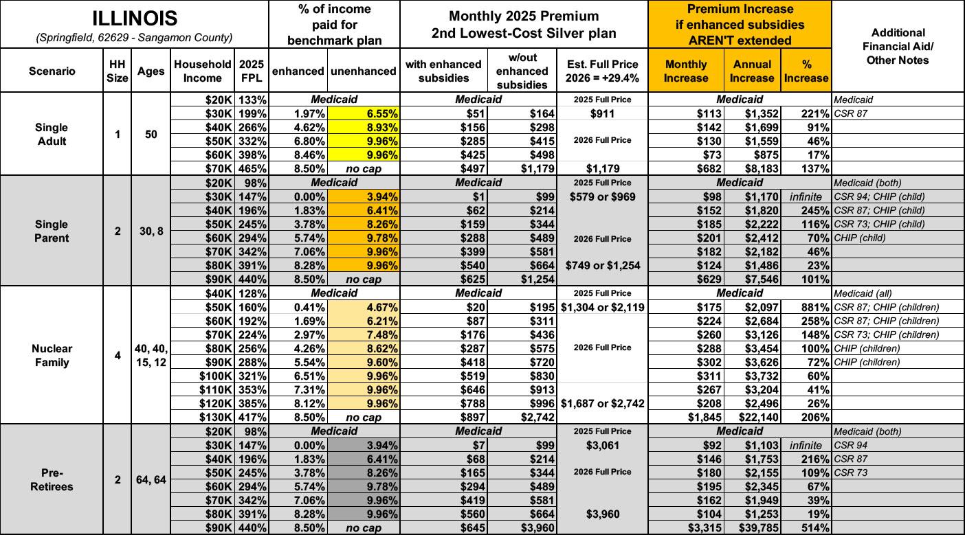 Illinois has around ~466,000 residents enrolled in ACA exchange plans, 90% of whom are currently subsidized. I estimate they also have another ~57,000 unsubsidized off-exchange enrollees.