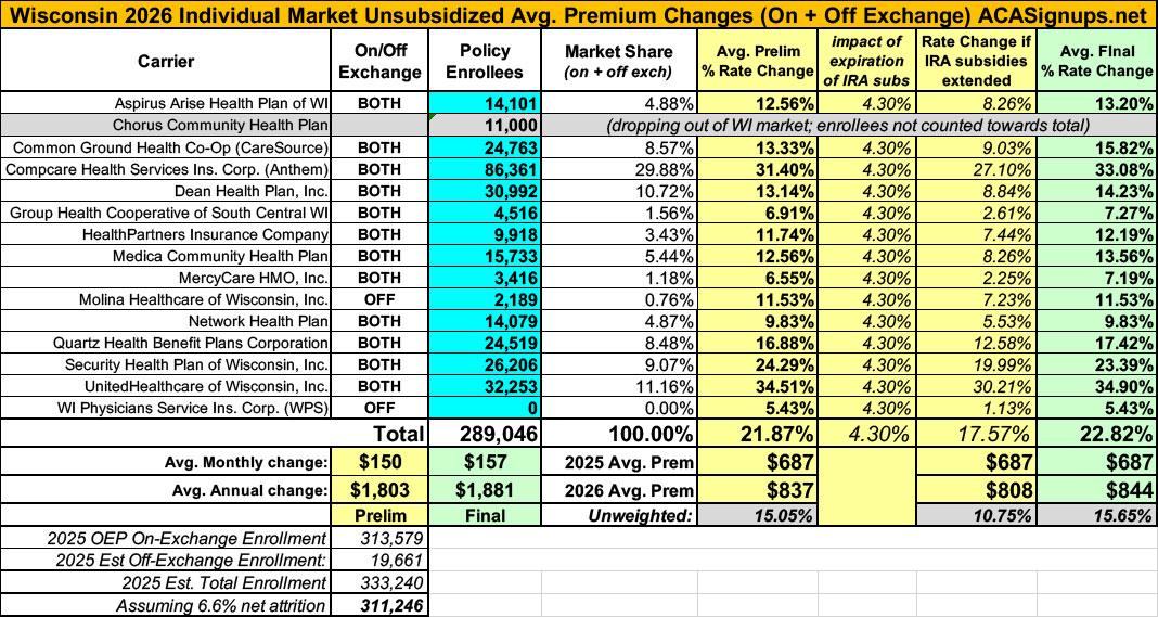 Wisconsin has around ~293,000 residents enrolled in ACA exchange plans, 98% of whom are currently subsidized. I estimate they also have another ~19,000 unsubsidized off-exchange enrollees.