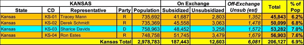 Kansas has around 200,000 residents enrolled in ACA exchange plans, 94% of whom are currently subsidized. I estimate they also have another ~6,000 unsubsidized off-exchange enrollees.