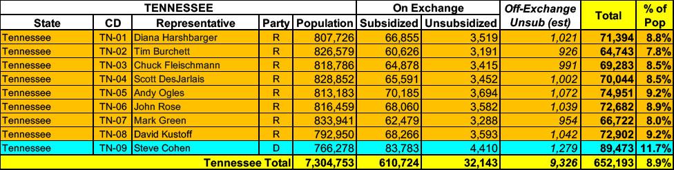 Tennessee has around ~642,000 residents enrolled in ACA exchange plans, 95% of whom are currently subsidized. I estimate they also have another ~9,000 unsubsidized off-exchange enrollees.