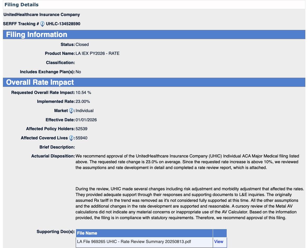 UPDATE 8/14/25: Ambetter and HMO Louisiana have submitted revised filings which, combined with my revising my estimate of the total LA individual market down to 286,000, results in the weighted average rate increase going up by 2 points to 23.9%.