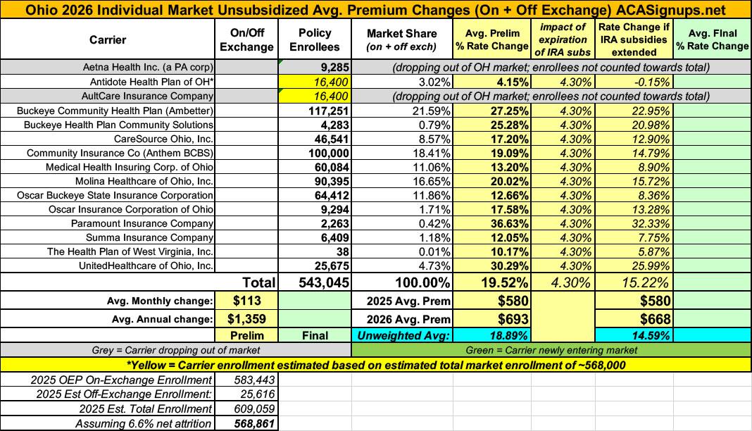 Ohio's total 2025 OEP enrollment was ~583,000 people, and using 2024 CMS liability risk score data, I estimate another ~26,000 off-exchange enrollees, or ~609,000 total.