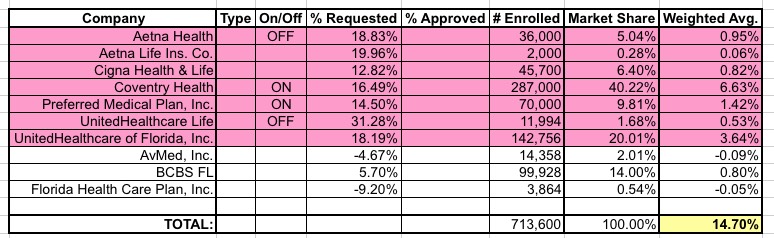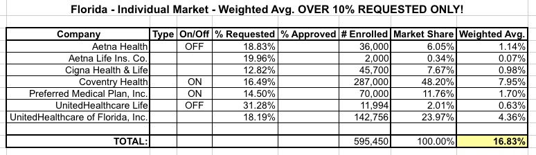 The Rate Review database at Healthcare.Gov is a very useful tool for any insurance company requesting rate increases above 10%, but it's completely useless for requests below 10%. As such, I have hard data on the requested increases for about 600,000 Florida residents: