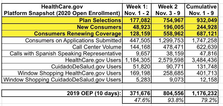 In week two of the 2020 Open Enrollment, 754,967 people selected plans using the HealthCare.gov platform. As in past years, enrollment weeks are measured Sunday through Saturday. Consequently, the cumulative totals reported in this snapshot reflect one fewer day than last year.