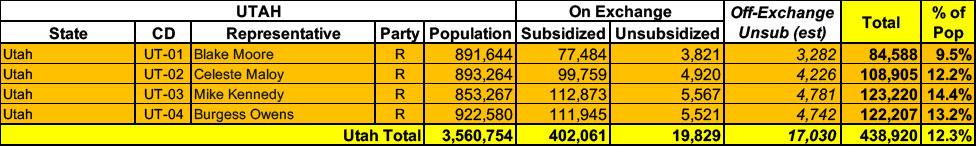 Utah has around ~421,000 residents enrolled in ACA exchange plans, 95% of whom are currently subsidized. I estimate they also have another ~17,000 unsubsidized off-exchange enrollees.
